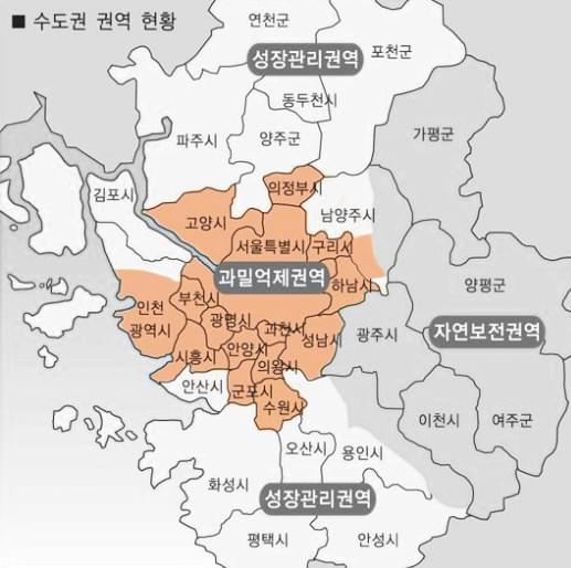 경기도는 크게 '과밀억제권역'과 '그 외 지역'으로 나뉩니다.